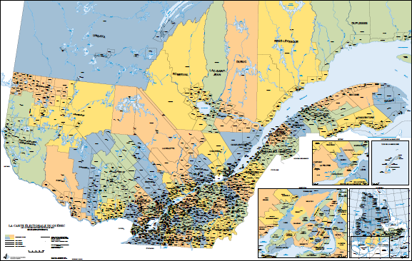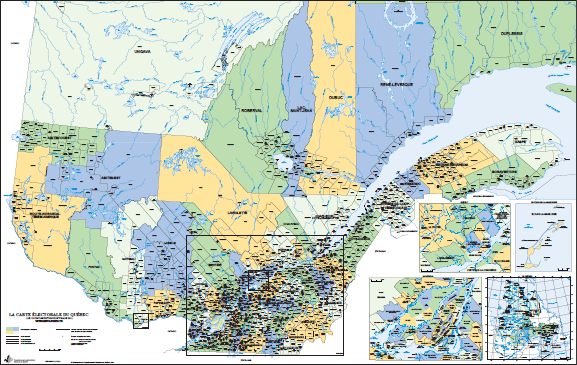 The official electoral map, published by the Commission de la représentation électorale, includes all of Québec’s 125 provincial electoral divisions. The boundaries of the electoral divisions given on the map were those in effect for the 2012 and 2014 general provincial elections.