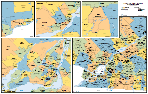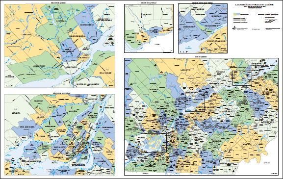The official electoral map, published by the Commission de la représentation électorale, includes all of Québec’s 125 provincial electoral divisions. The boundaries of the electoral divisions given on the map were those in effect for the 2003 and 2007 general provincial elections.