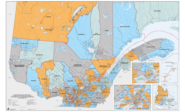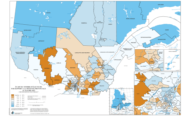 Current electoral map showing deviations in the number of electors from the provincial average as of April 30, 2023 (in French).