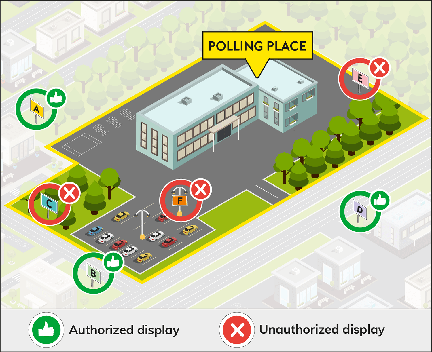 If voting is taking place in a school, the playground is part of the polling place, so no signs may be placed there. Signs can be posted on the streets and on property near the polling place.